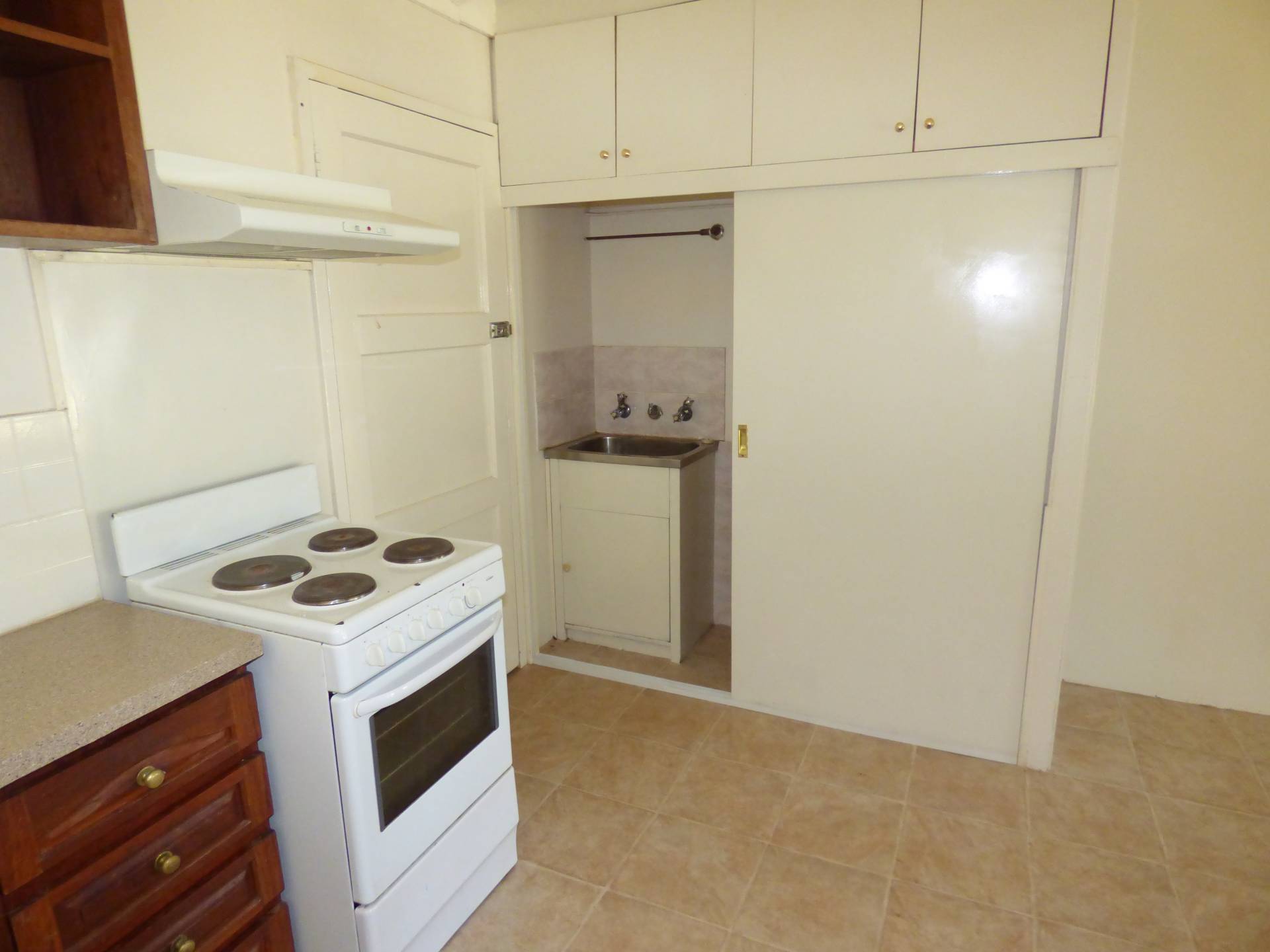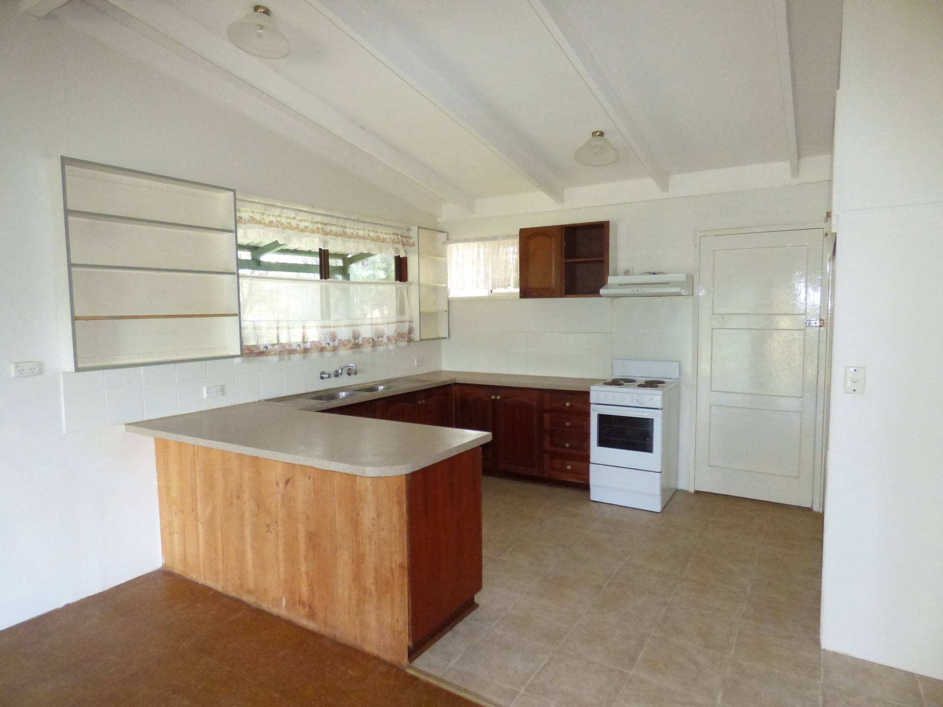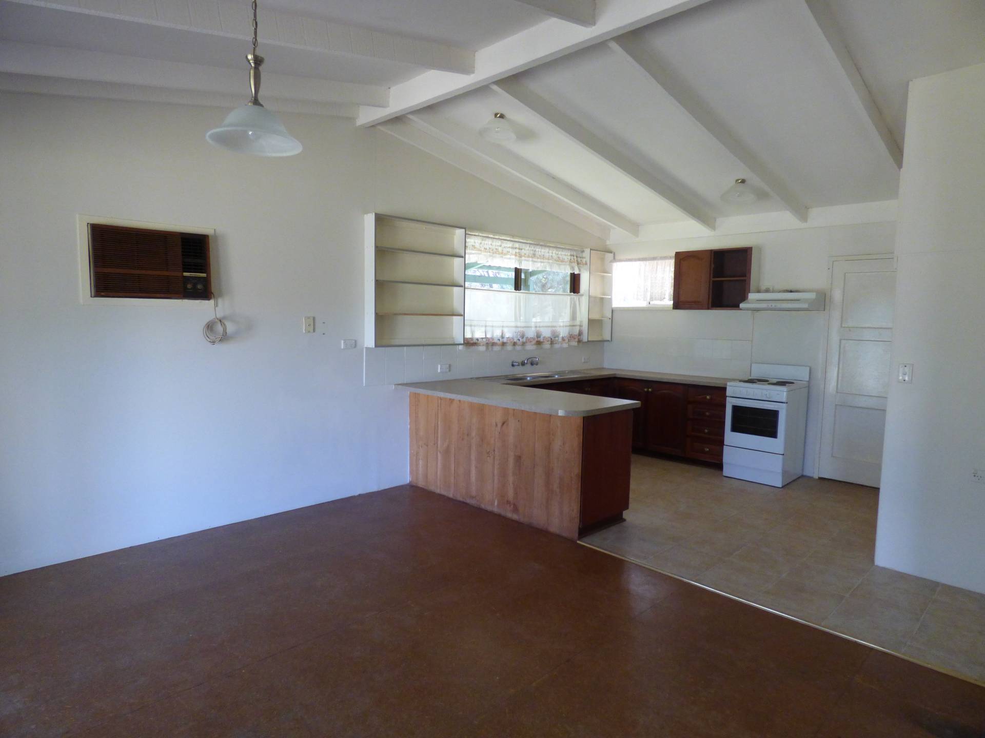 The kitchen is open plan and is combined with the laundry area. You have plenty of cupboard space and electric cooking. The laundry is hidden behind the large cupboard doors with room for a washing machine next to the trough.