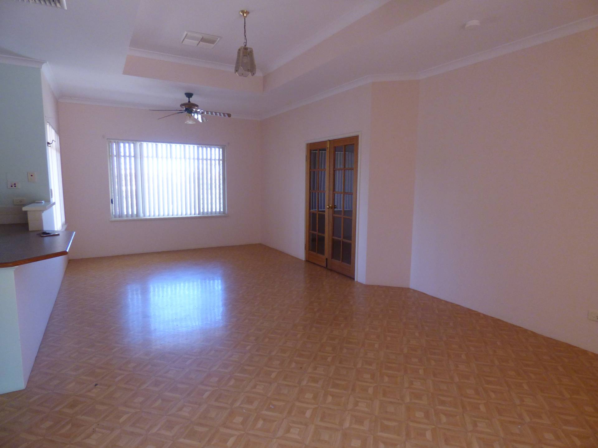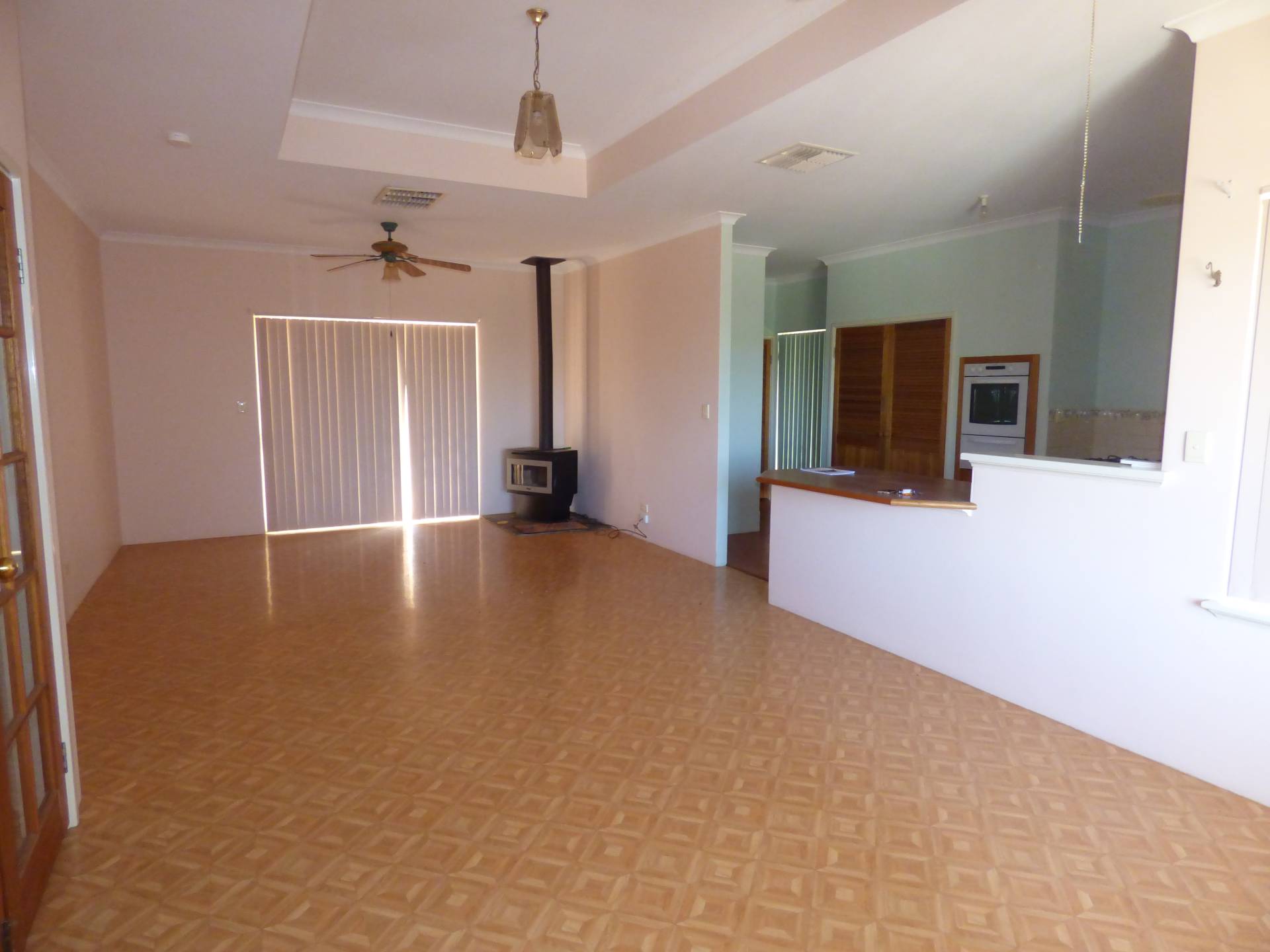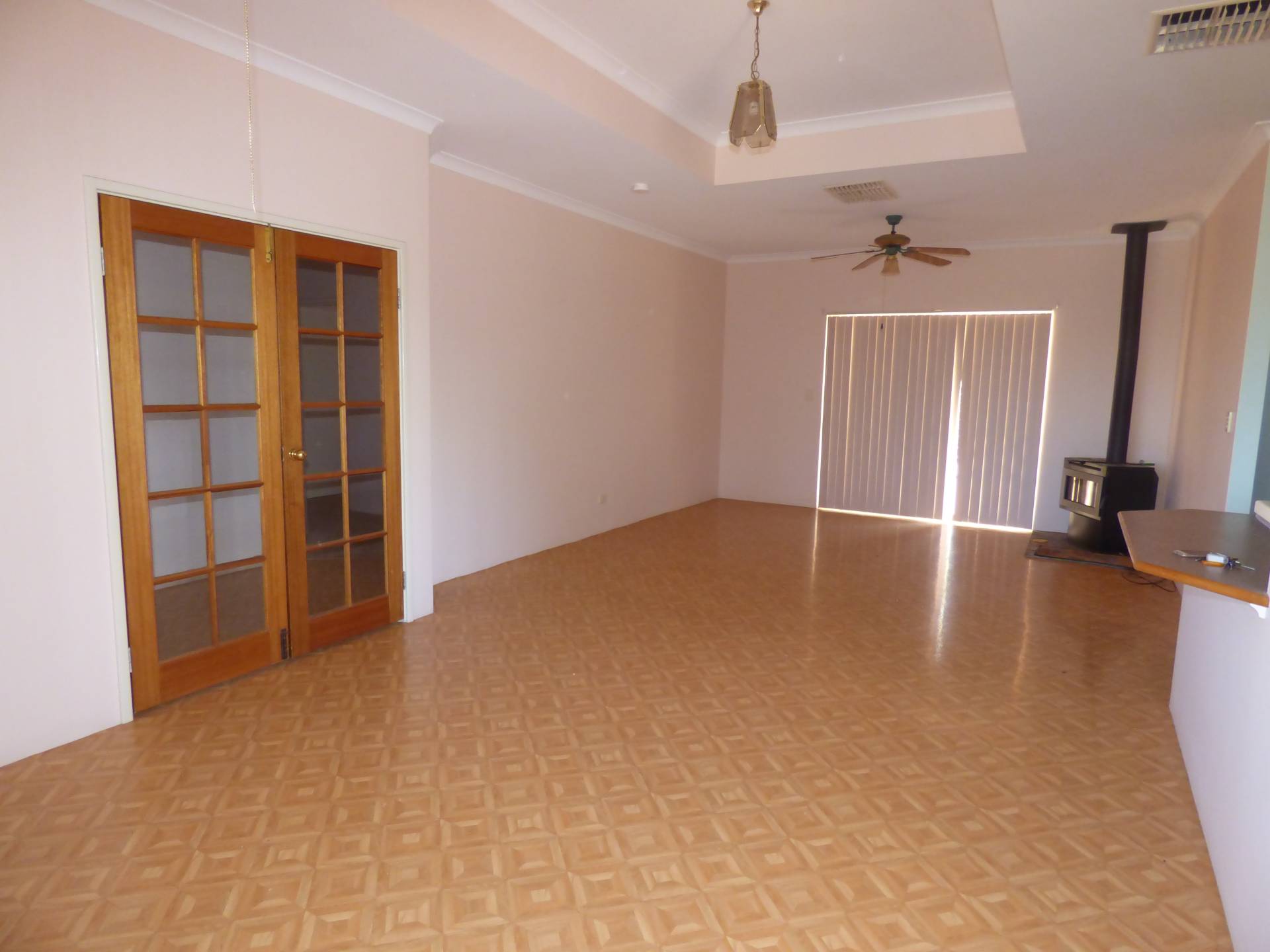 To the right, you walk through double French doors to the large living/dining area with tiles throughout. This area is serviced by a wood fire place, two ceiling fans and has rear access through sliding doors.