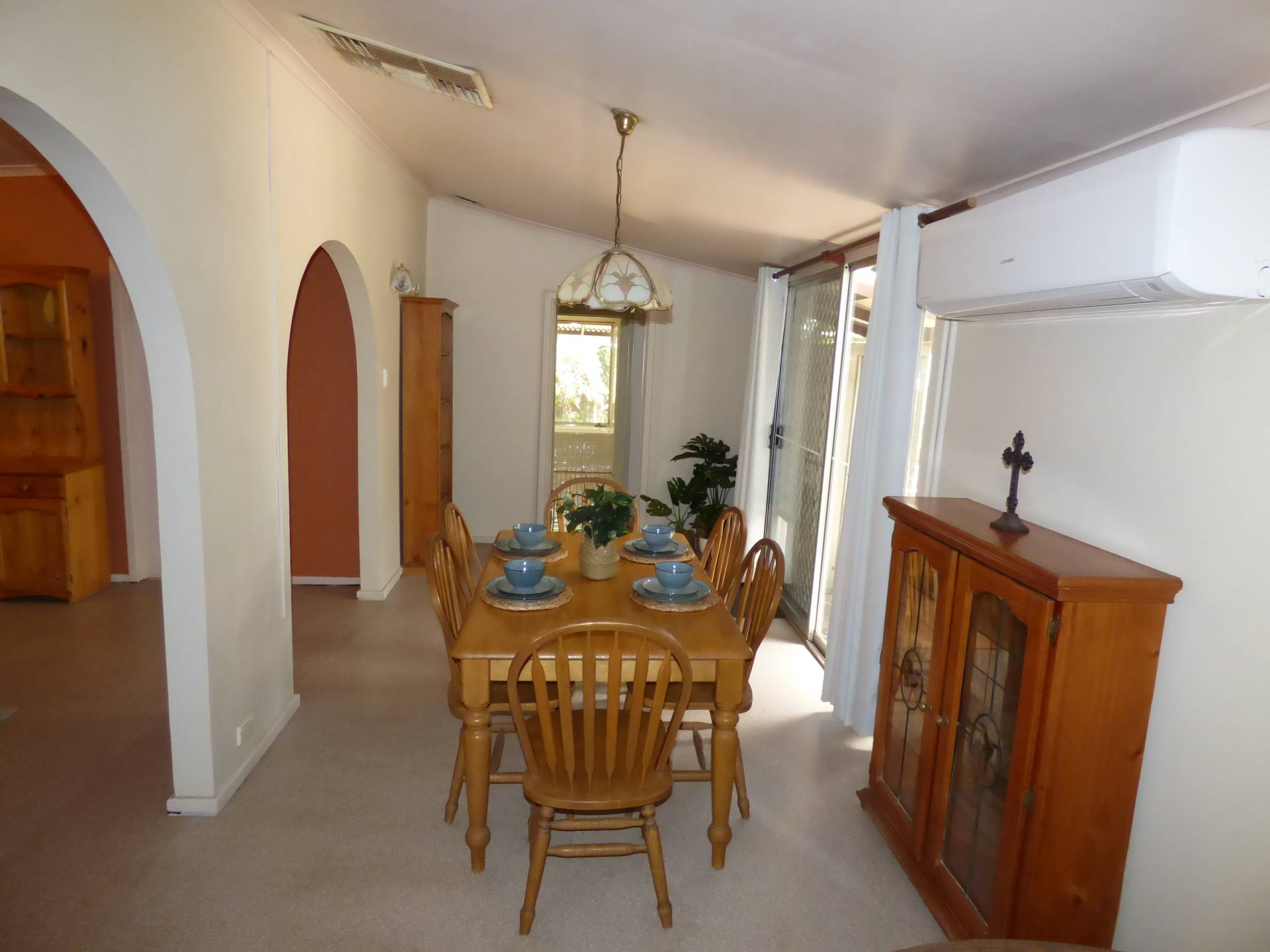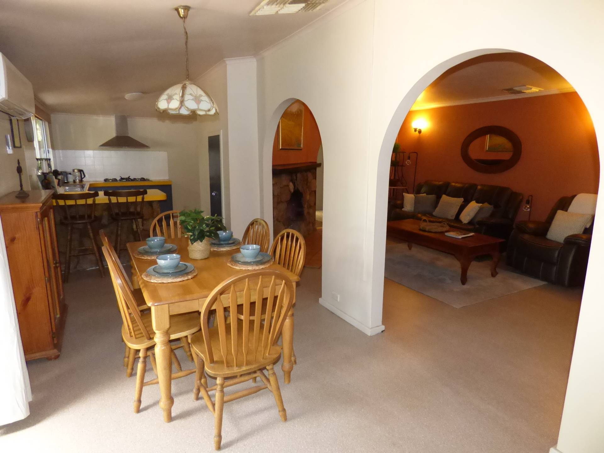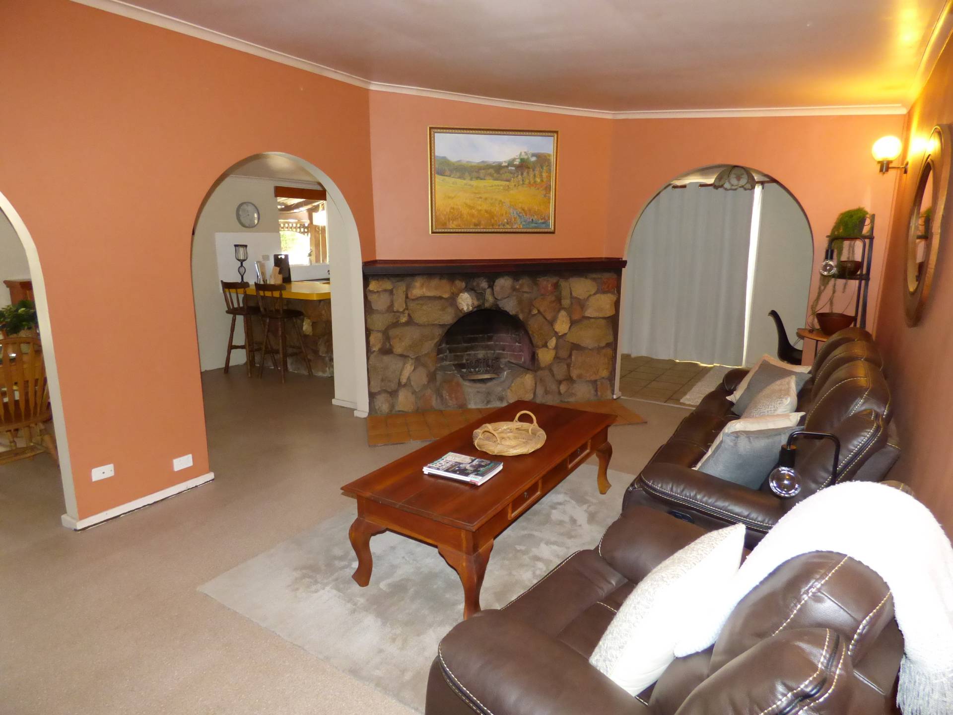 The open and connecting loungeroom is the central hub of this home which features a stunning stone work open fire place and arched doorways. In the room you can retreat to the comfortable study nook or walk through to the elongated kitchen/dining area. This space is serviced with a massive near new wall mounted split system air conditioner which does a great job at cool the main living spaces!