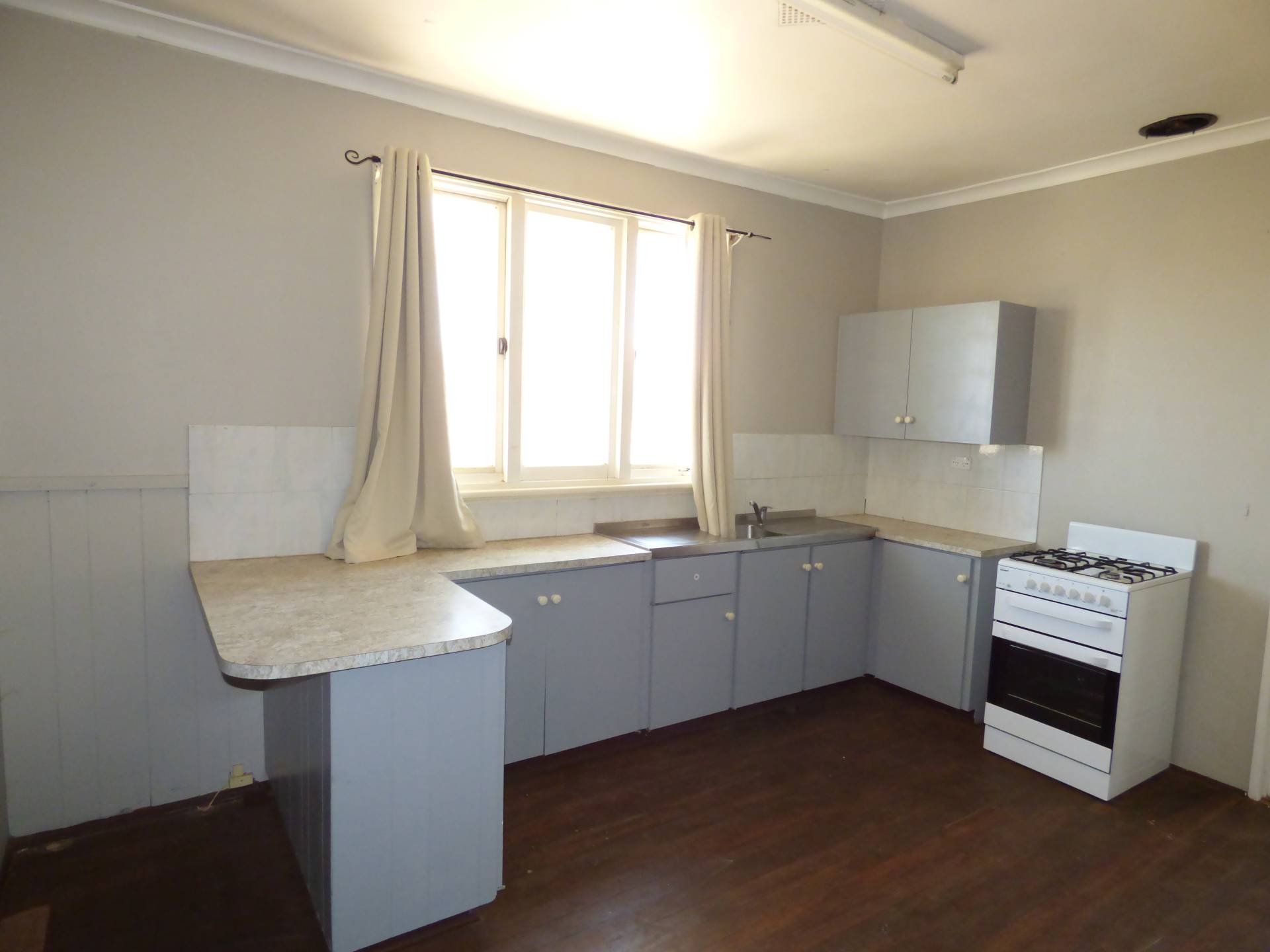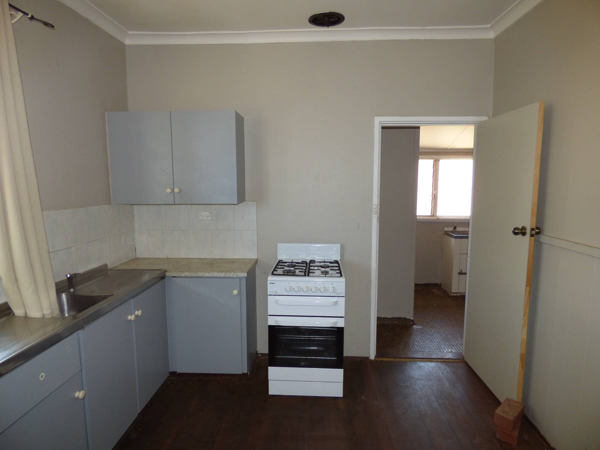 The kitchen contains a stand-alone gas stove and oven and plenty of cupboard storage.