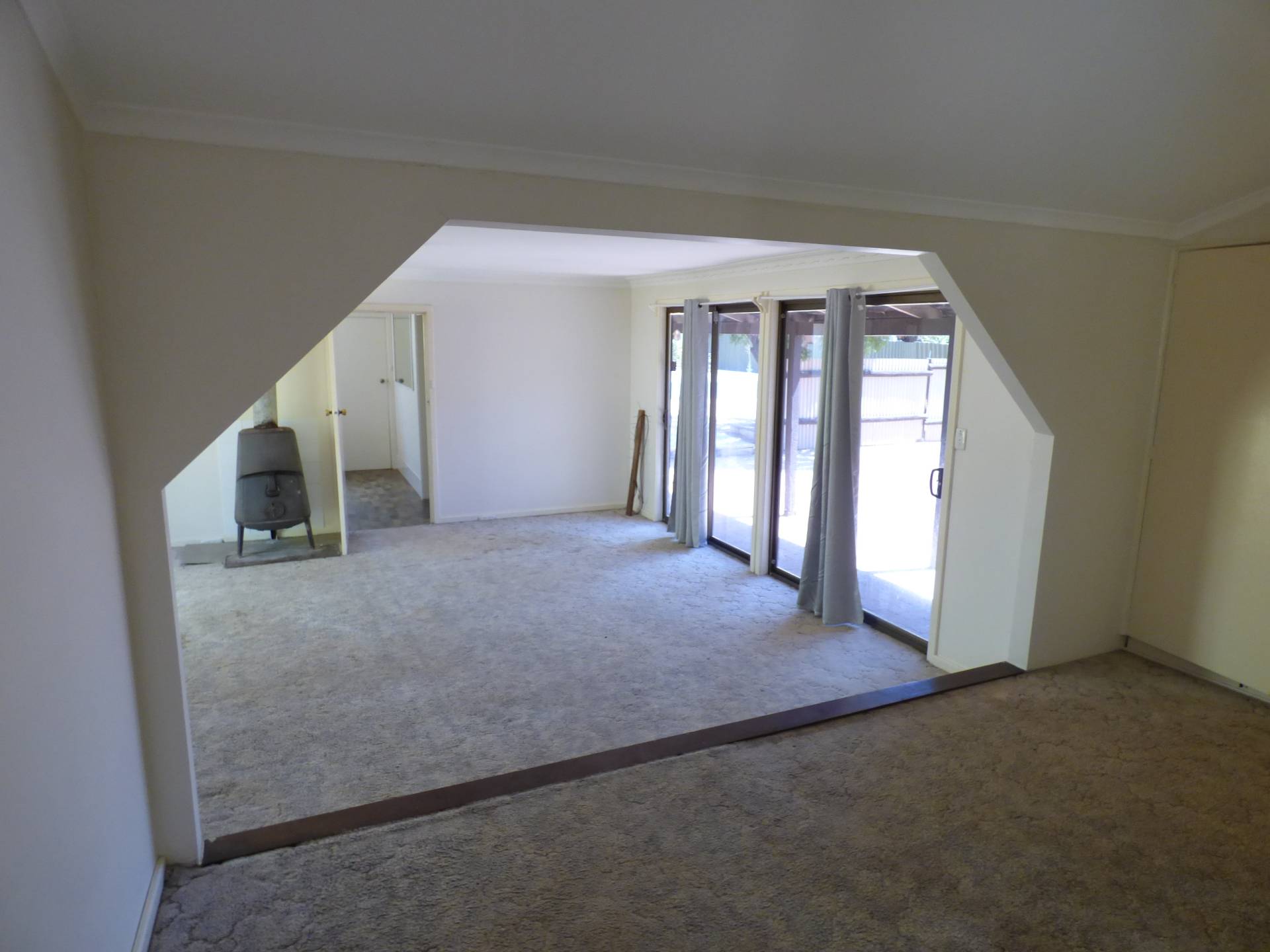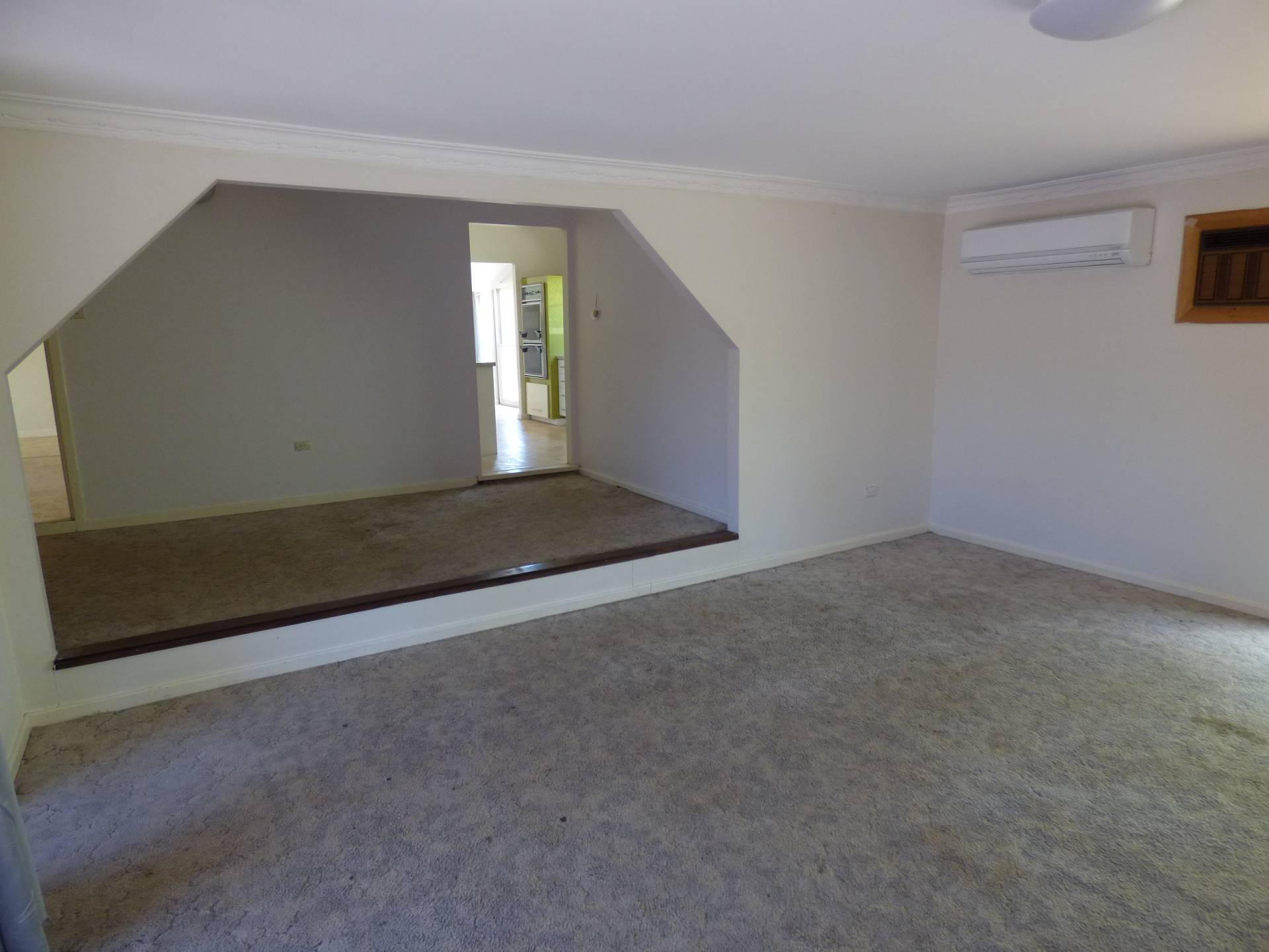 Large loungeroom is equipped with a wood fire place and split system air-conditioner.