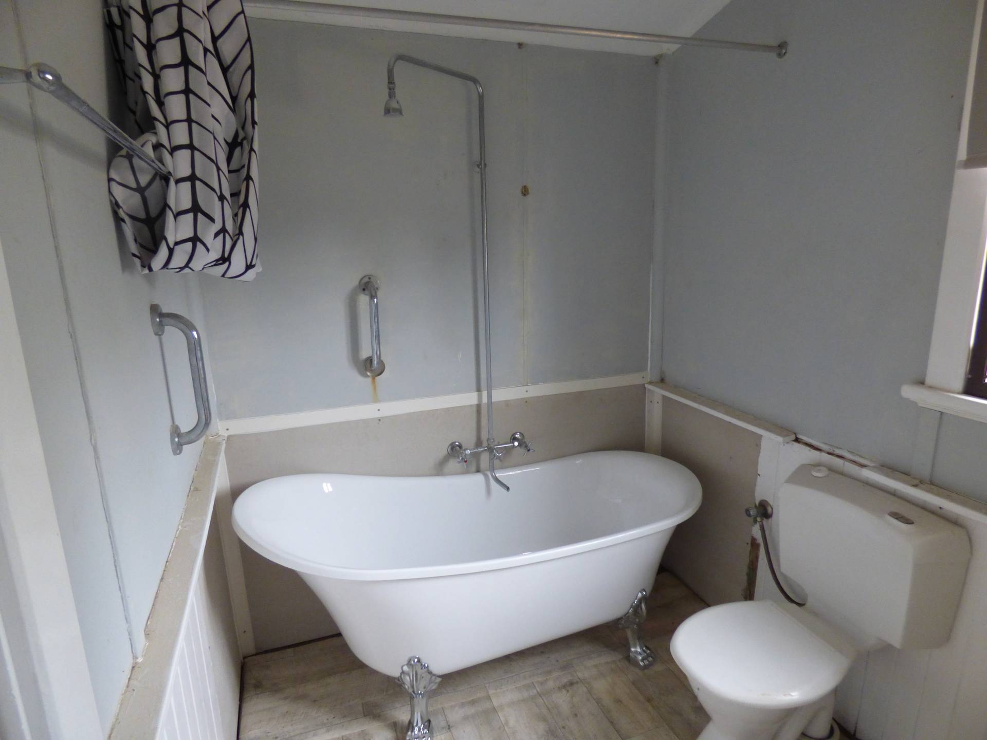 At the rear, you have the tidy bathroom with a shower over the bath, a vanity unit and the second toilet.