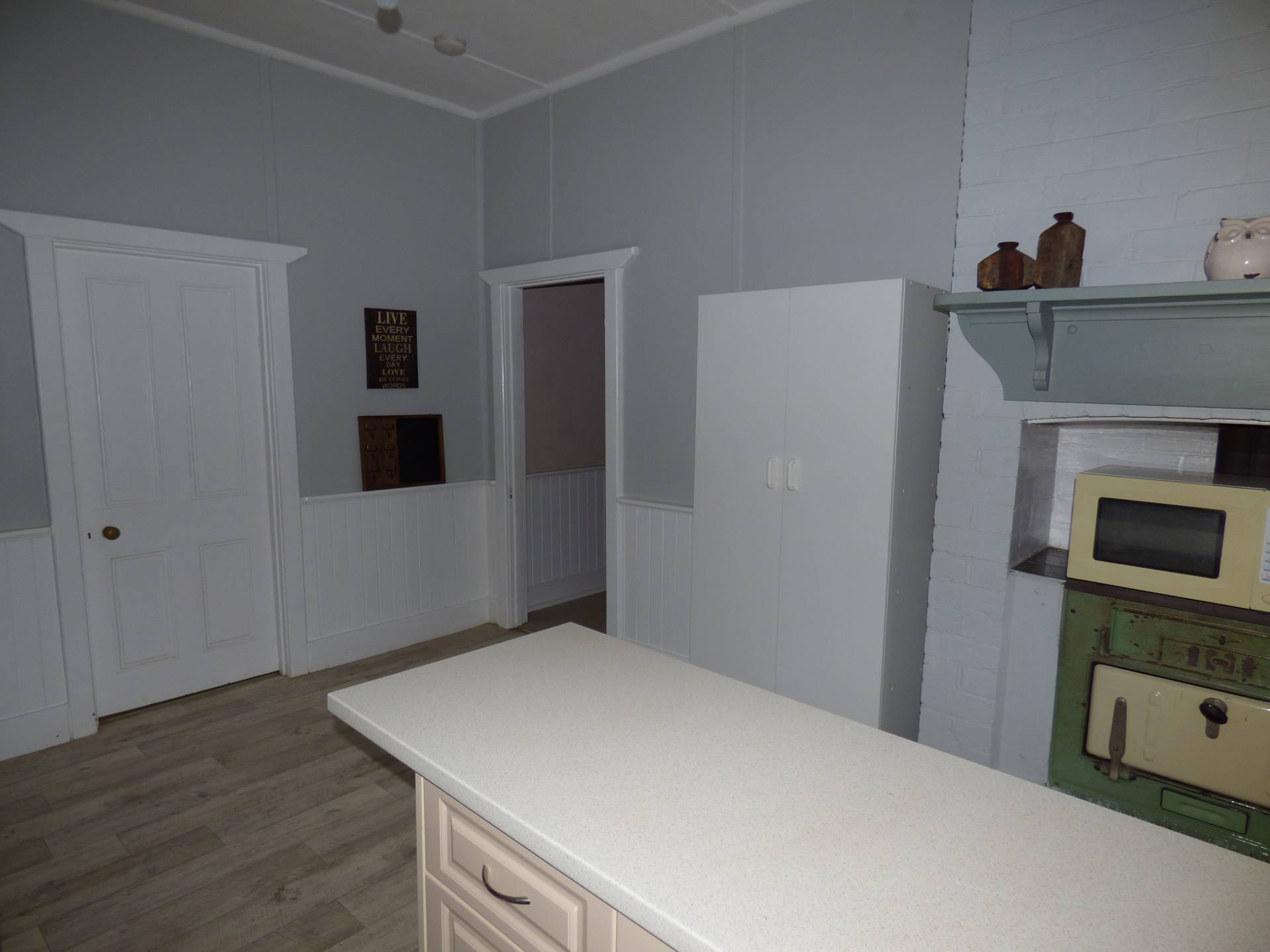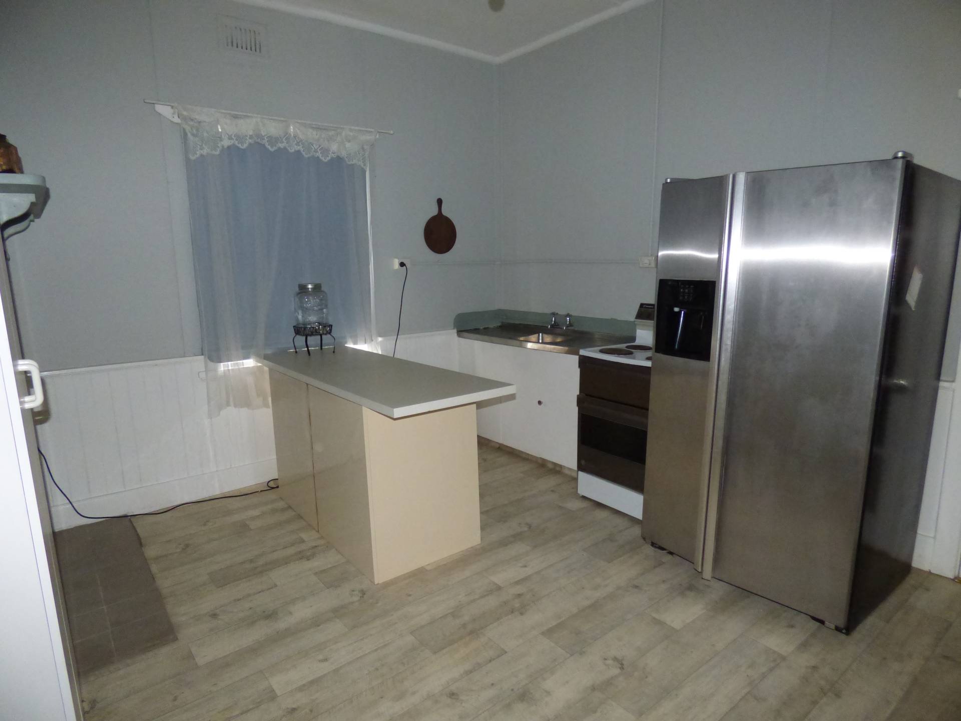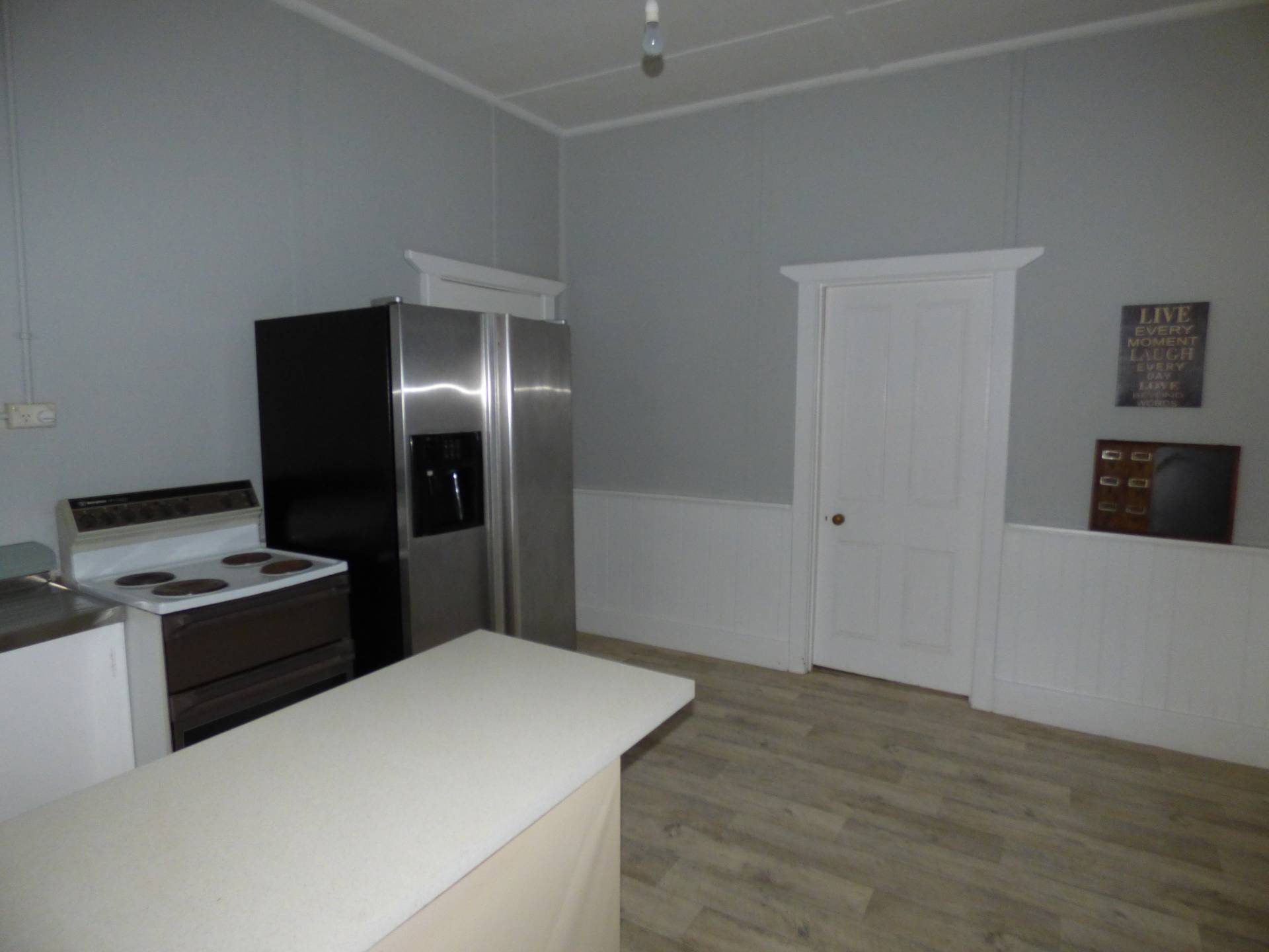 To the middle of the home is the kitchen which has been recently renovated. New lino flooring has been installed, as well as a new island bench for extra storage and bench space. An electric stove top and oven for cooking.