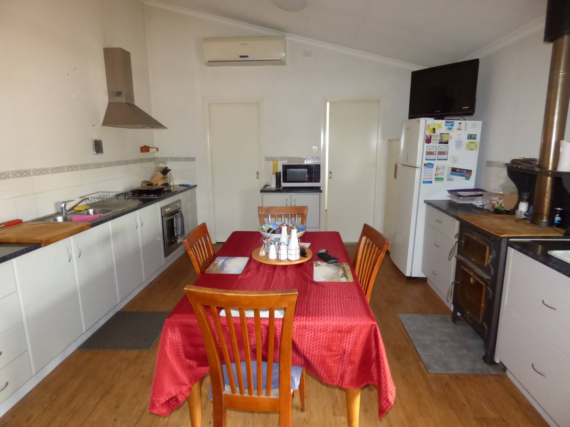 The kitchen has ample storage and comes with a stainless steel under bench oven and gas hotplates as well as a Bushman wood fired oven. There is a separate walk in pantry off of the kitchen.