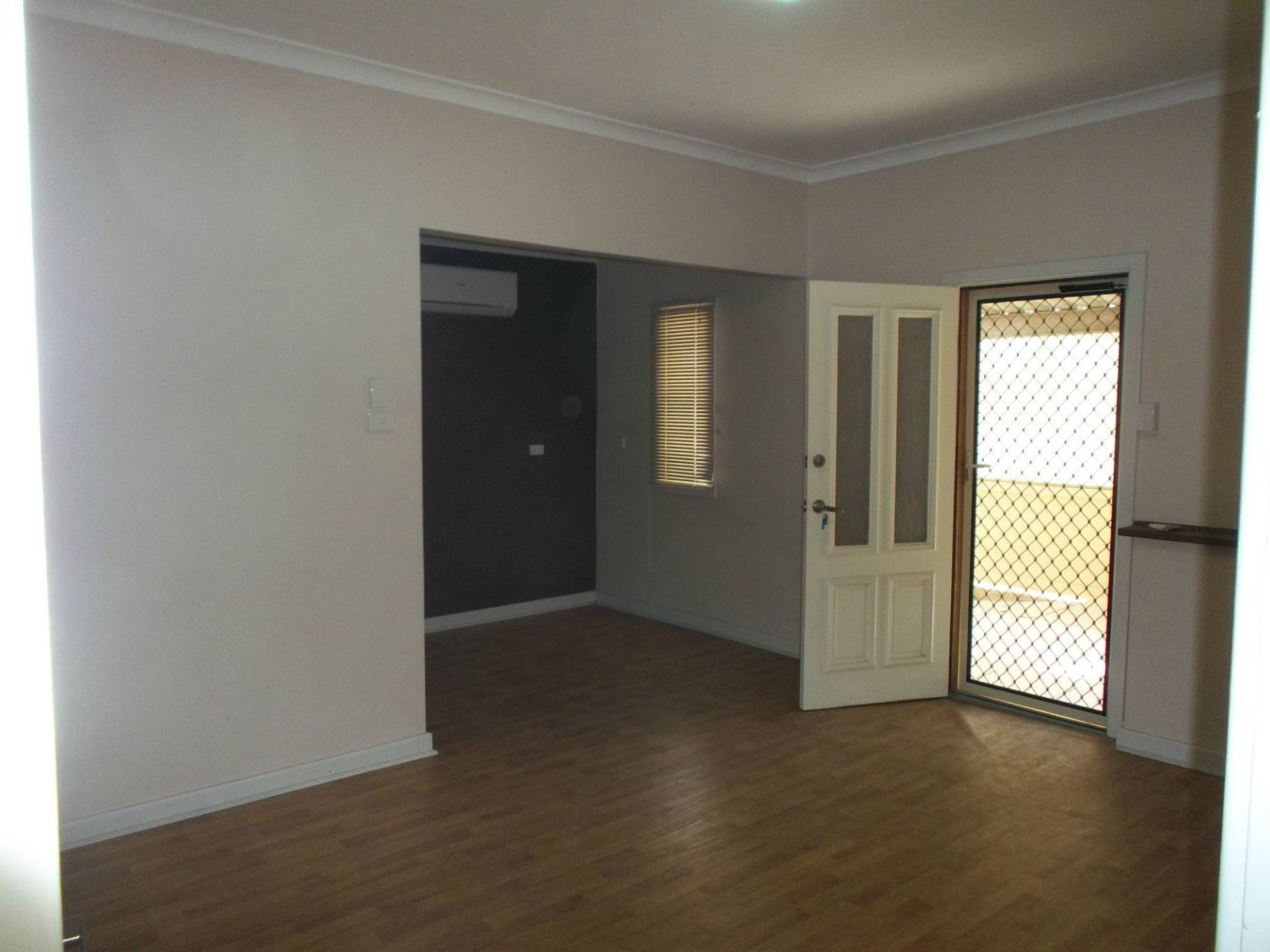 Front lounge room with split system air conditioner and separate dining nook.