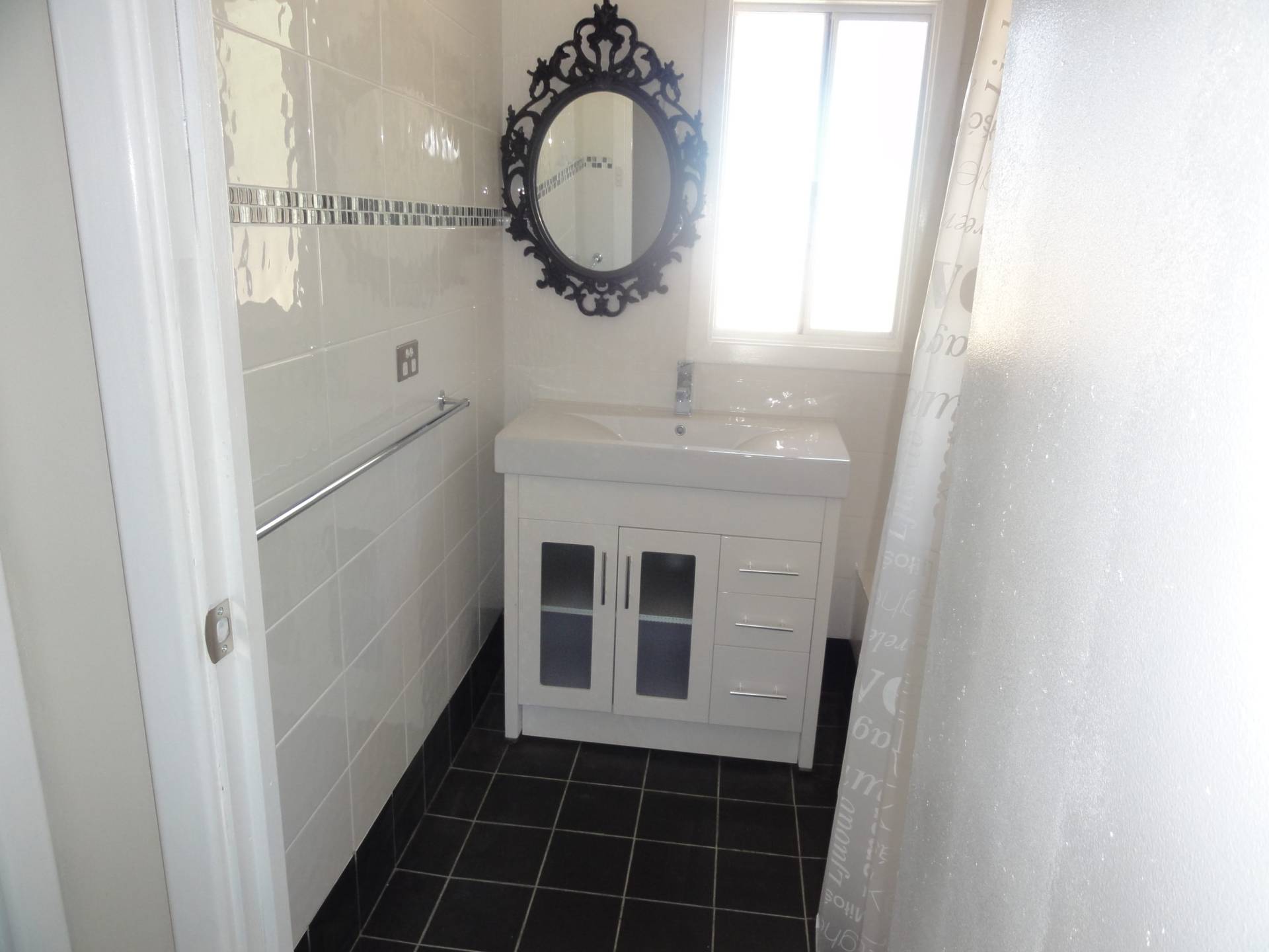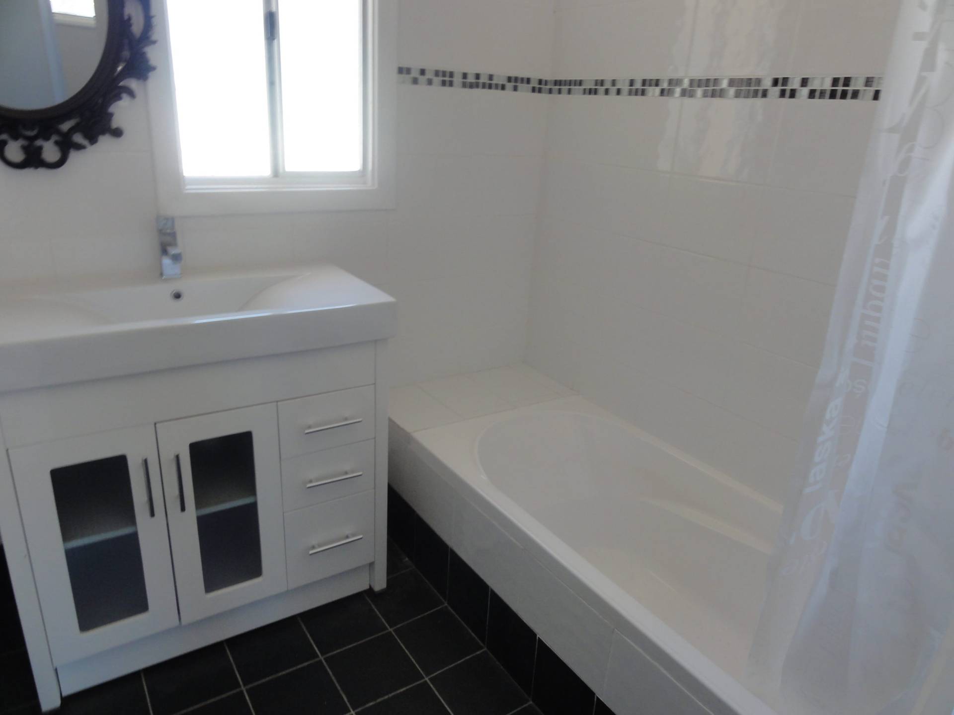 The bathroom has been all redone, has a new vanity and has been completely retiled all over making it bright and white and clean, still has the shower over the bath tub.