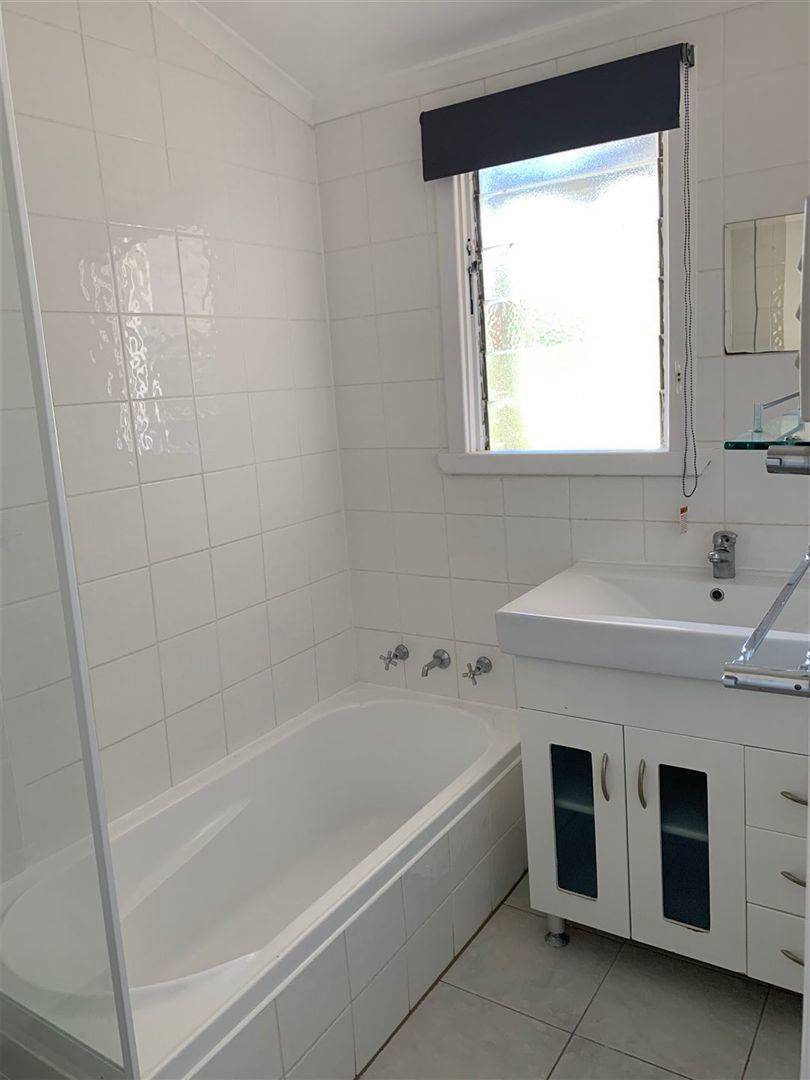 The bathroom is very tidy and has a vanity, bath tub and separate shower unit.