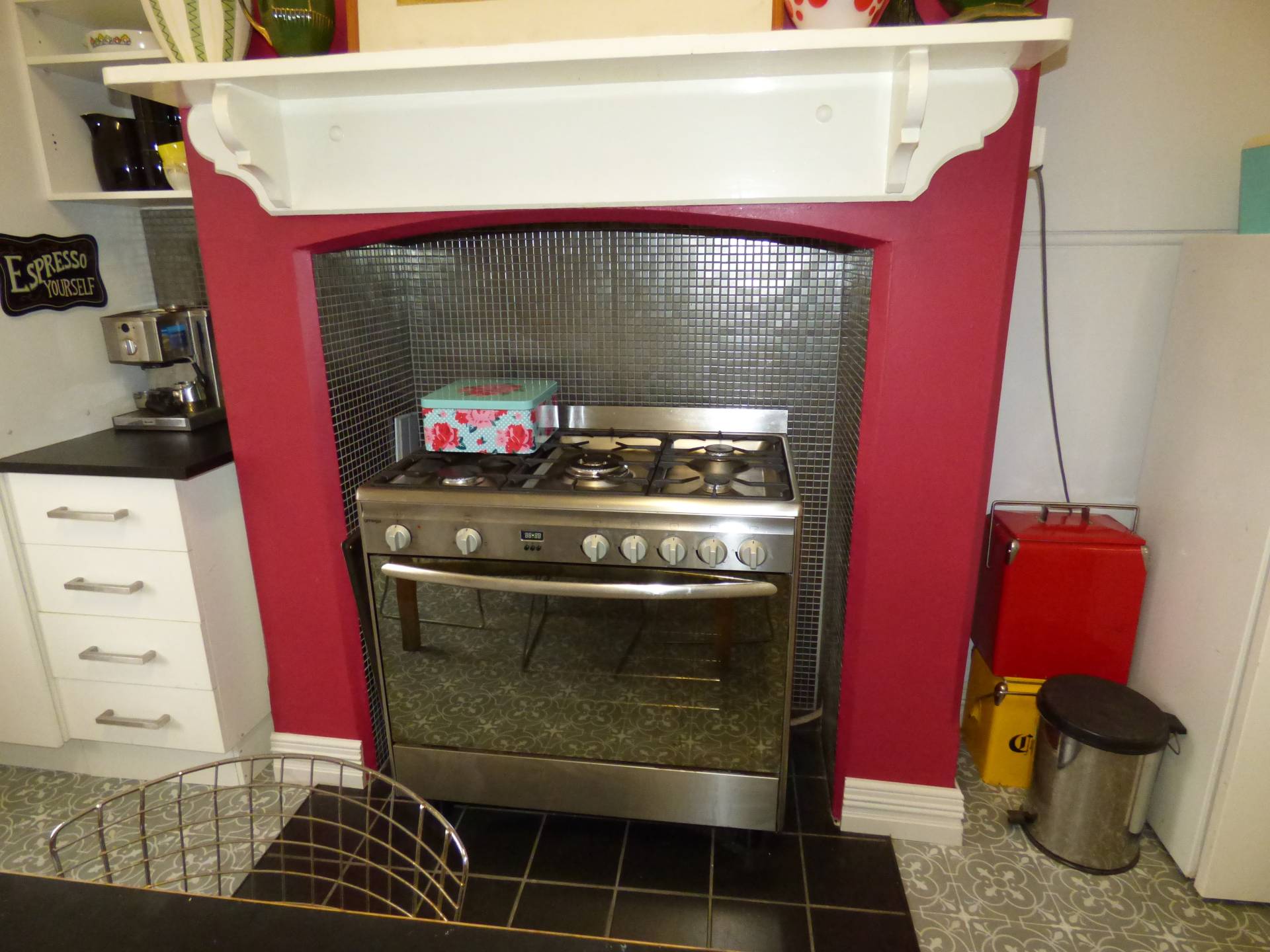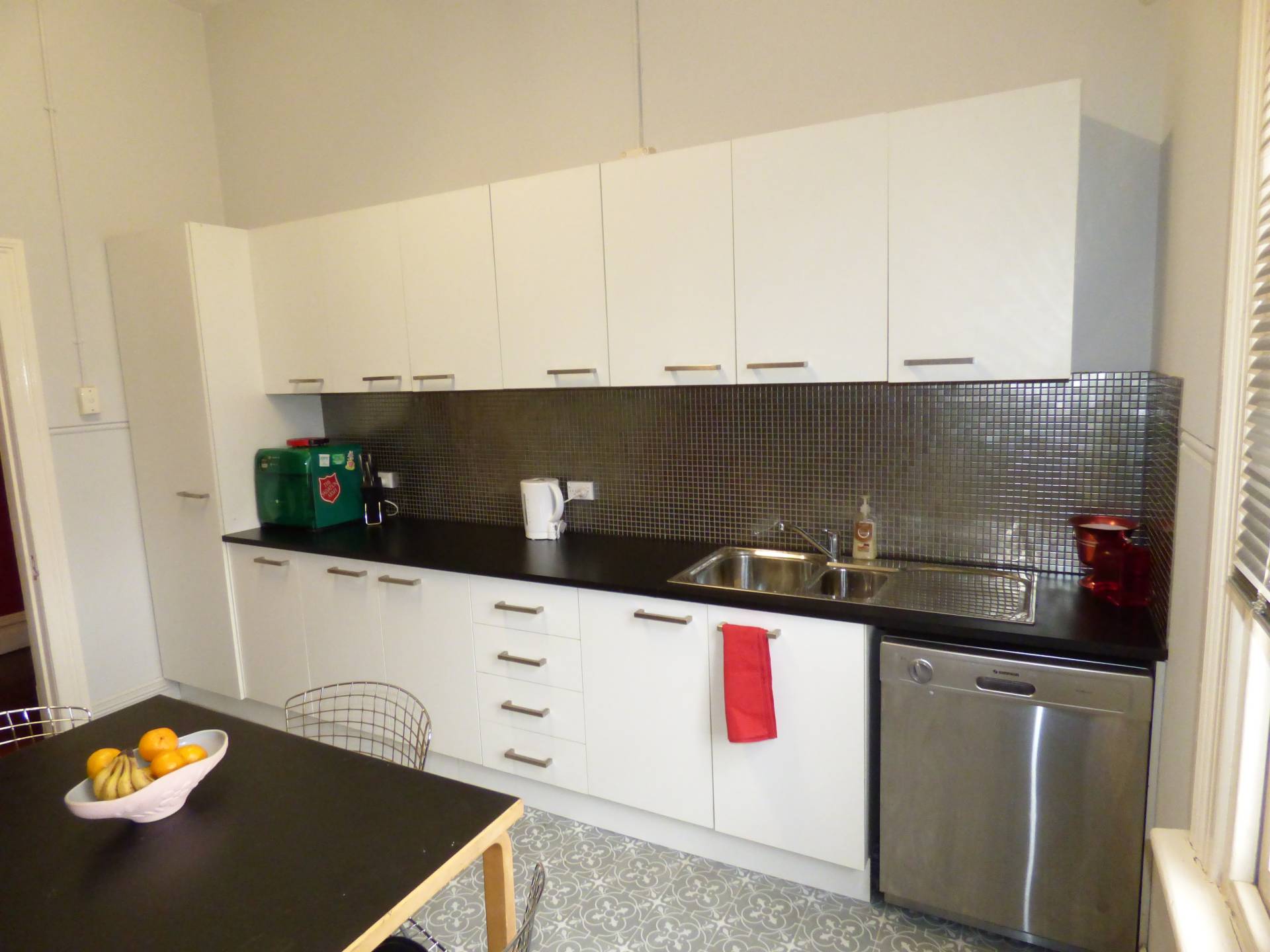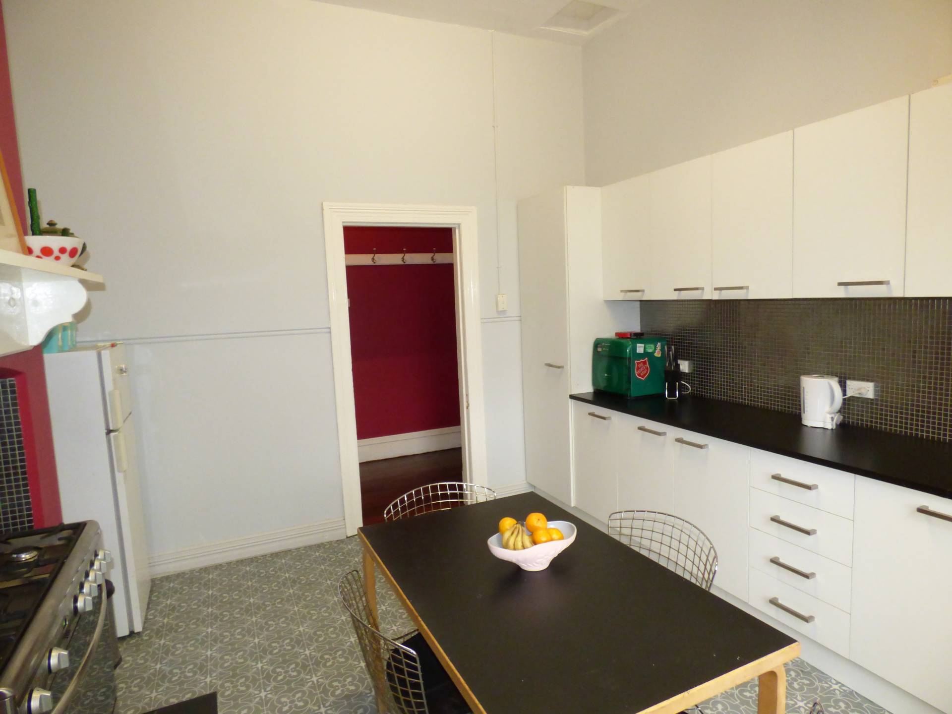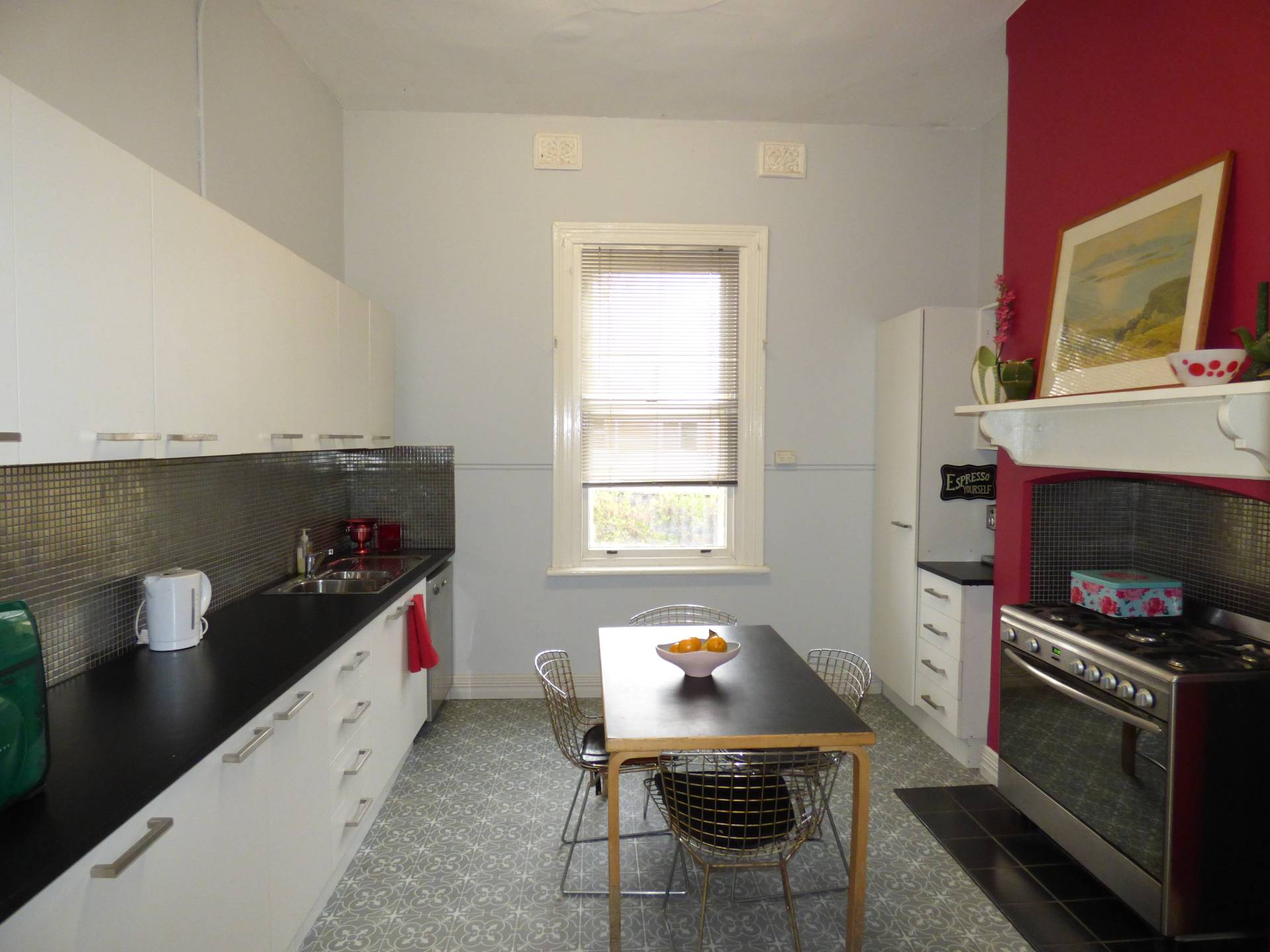 The functional kitchen has been fitted with a wall to wall benchtop work space along with both under bench and wall mounted cupboards as well as 2 tall kitchen pantries to either end of the space. The large gas 900ml stainless-steel free-standing oven is tucked away in the historical fireplace cove finishing off the kitchen with a fresh and spacious galley style appeal.