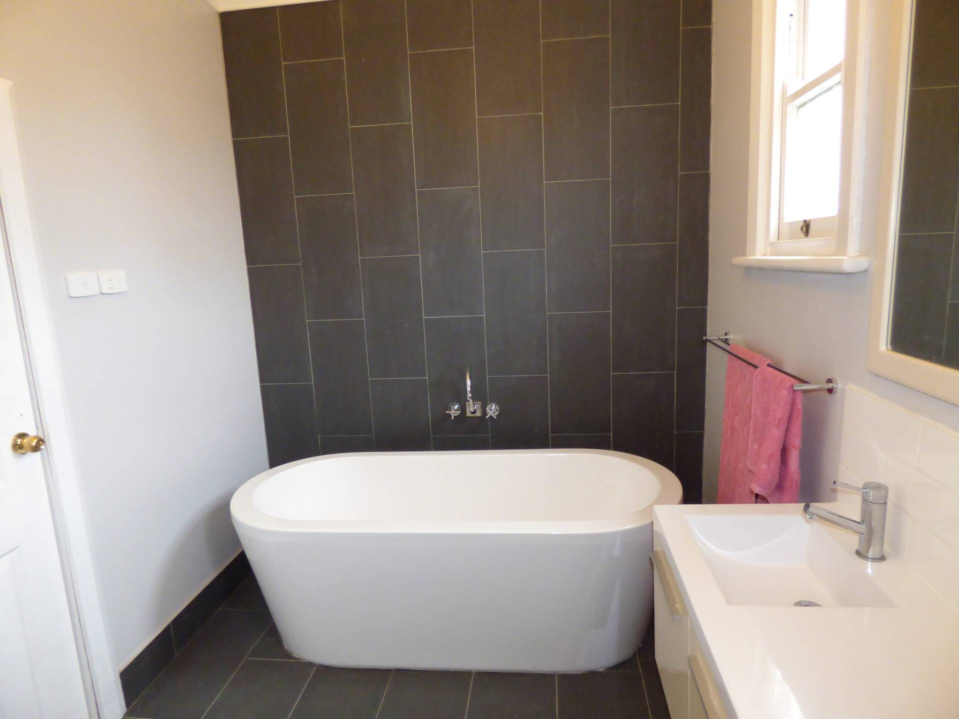 The spacious bathroom is fully renovated with floor to ceiling format tiles to the shower and bath walls and is equipped with a floating vanity unit, toilet, glass corner shower and classic oval free-standing bathtub. The two high windows allow plenty of natural light in.